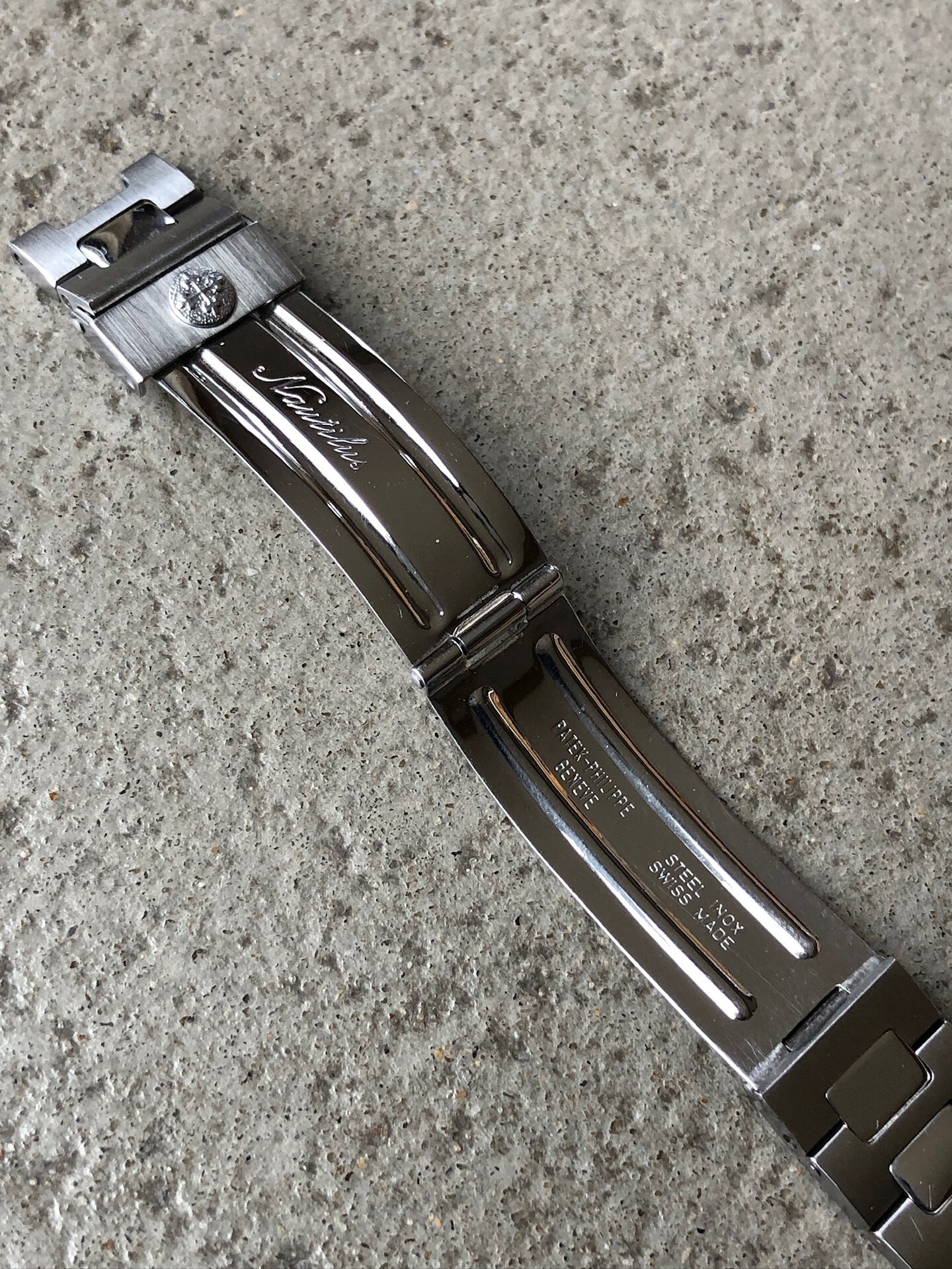 Dial: horizontal embossed blue dial plays with light and respects the specifications Mr. Stern imposed to Mr Genta: « the true color of the ocean ». Sigma SWISS Sigma at 6h black date disc and accent on the GENEVE are typical features sought after by collector. The white gold hour index markers and hands are filled with tritium. They flash green and vanish quickly which is how the original tritium reacts.