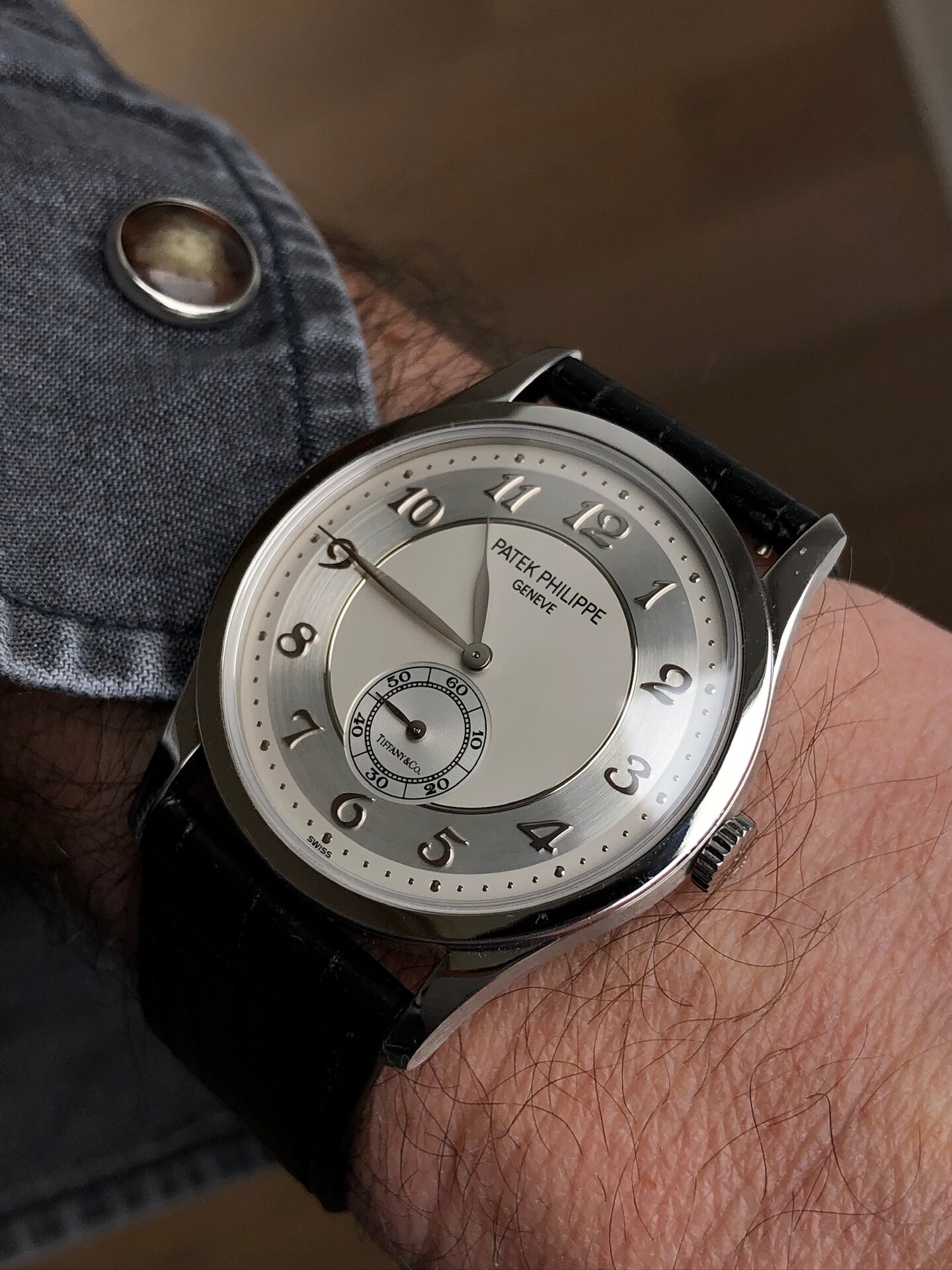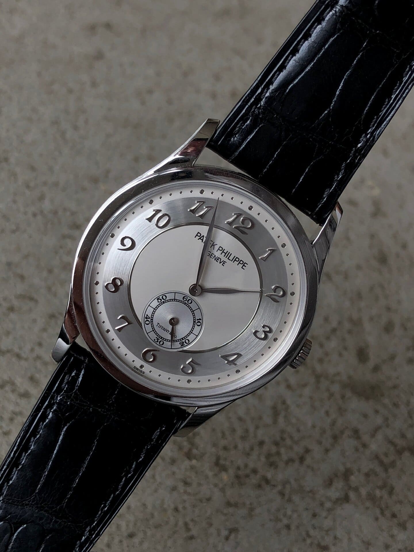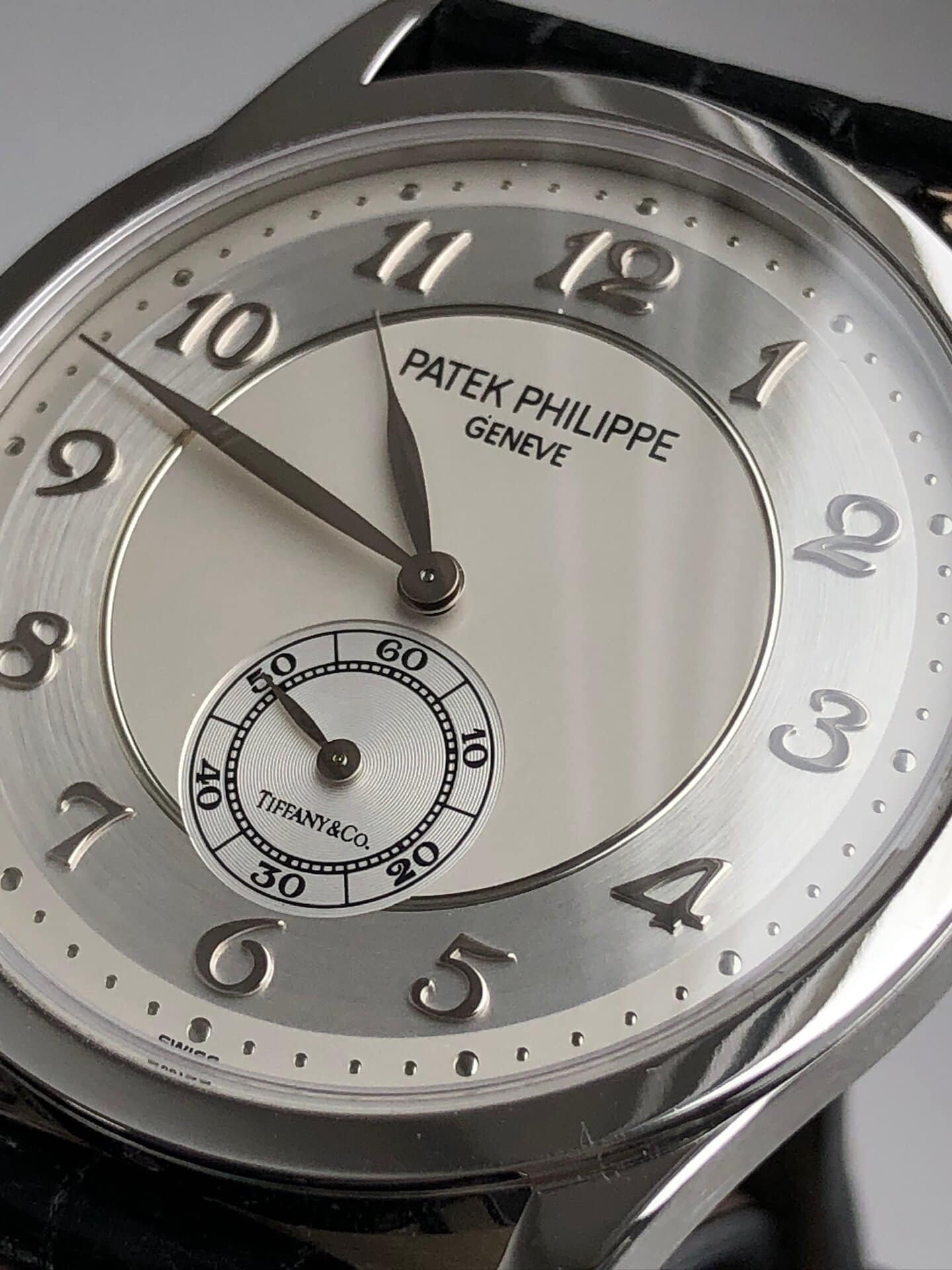 Dial: Two zone opalin center/aluminium brushed circle dial with applied Breguet numbers hour markers double signed by Tiffany & Co. Dauphine hands.