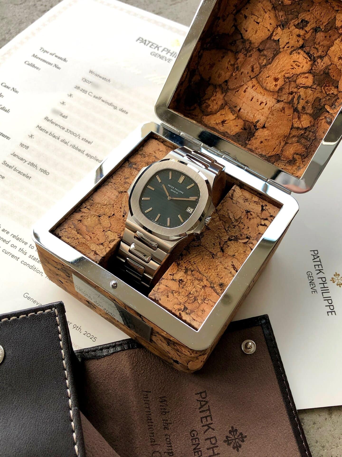 Box & papers: original cork box can be included or sold separately in which case a Patek burgundy leather travel box would be included. Comes with its extract from Patek Philippe archives.