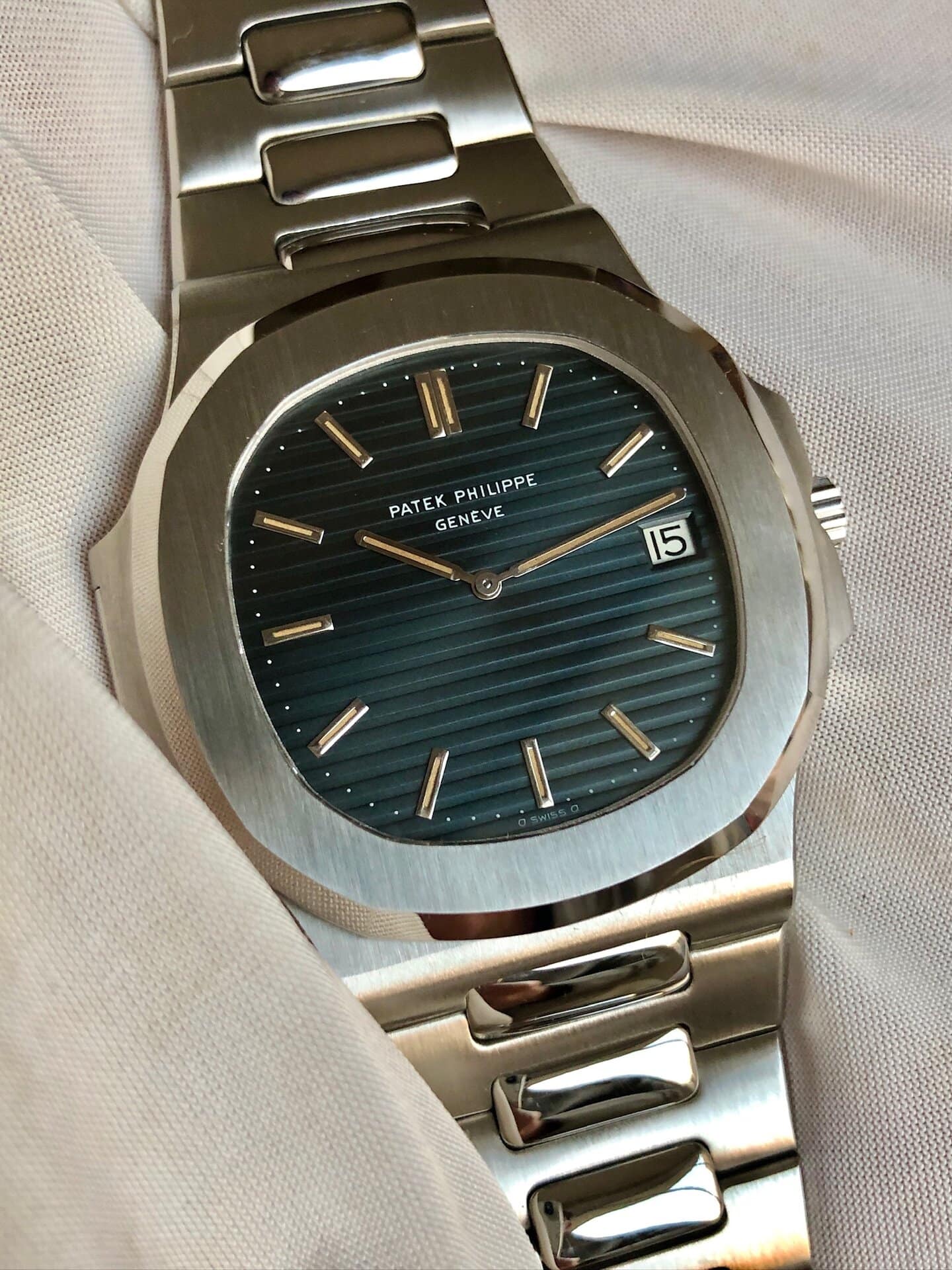 Dial: Patek Philippe has asked to the designer Gerald Genta to come up with a dial reflecting «the true color of the ocean» for this water sports watch. This ended up initially with a very dark blue/grey color. Some of these dial caught a patina with time. This is exactly the case with this one which developed a stunning blue hue which is enhanced by its magnificent condition. The tritium luminous on both the original hands and white gold indexes are matching and they are perfectly working (glow green and quickly vanish). The font belongs to the « type 1B » which is matching the case/movement period according to scholar « mstanga » story book on ref.3700 Nautilus.
