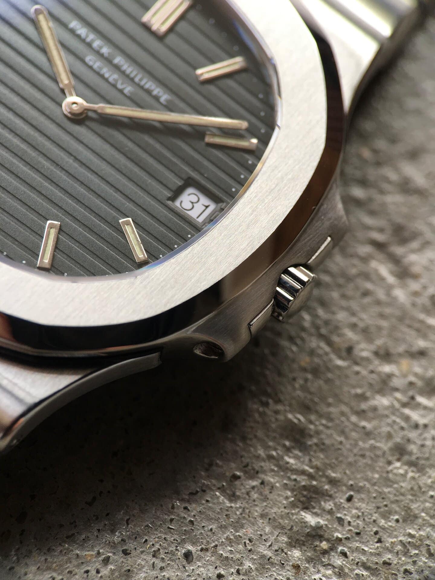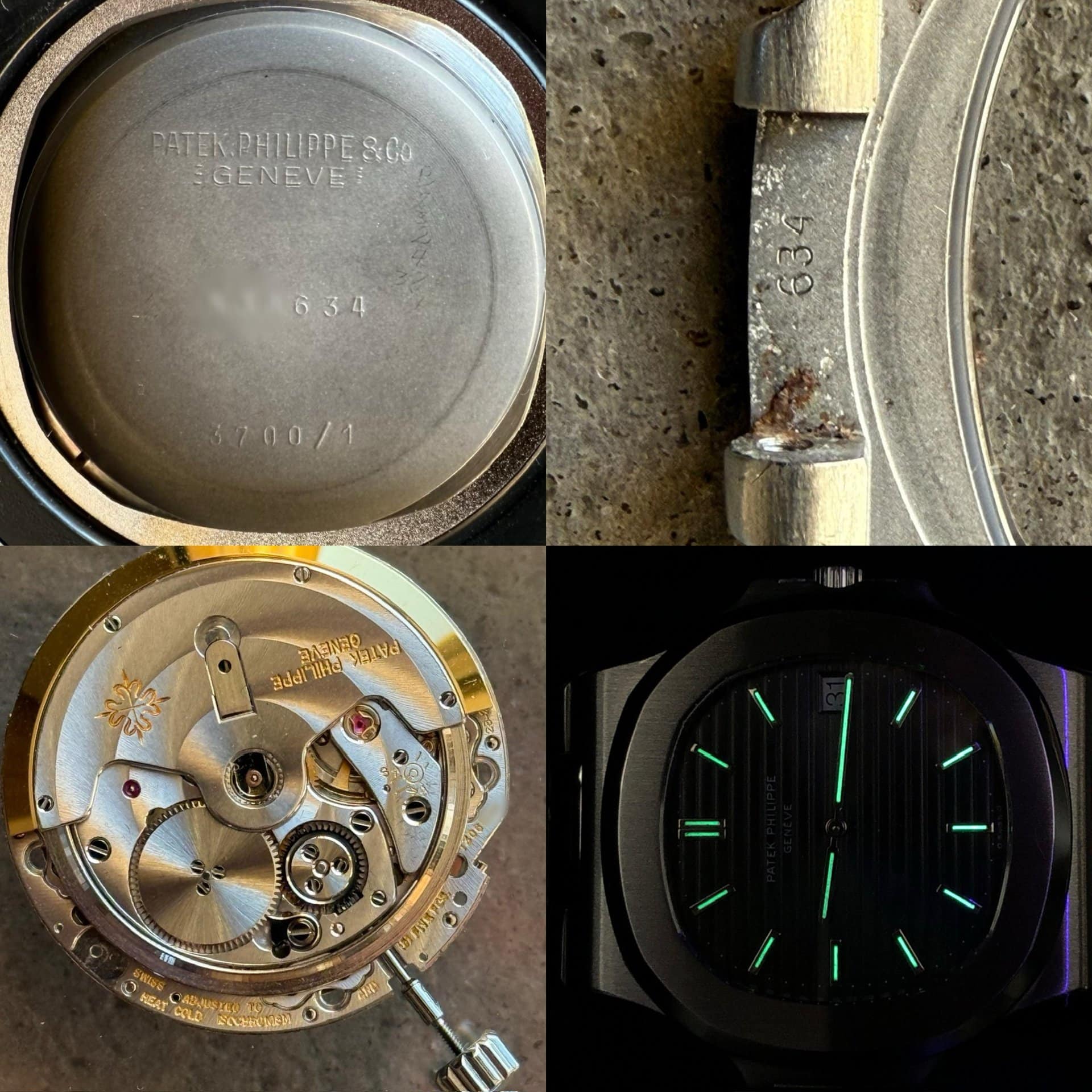 Case: very thick case highlighting a superb condition. The bezel has retained its initial thick proportions of the porthole pattern which is characteristic of the Nautilus reference. The last 3 digits of the case serial (634) can be found in the hinge of the bezel. A refined evidence proving the originality of the bezel that one can only find with Patek.