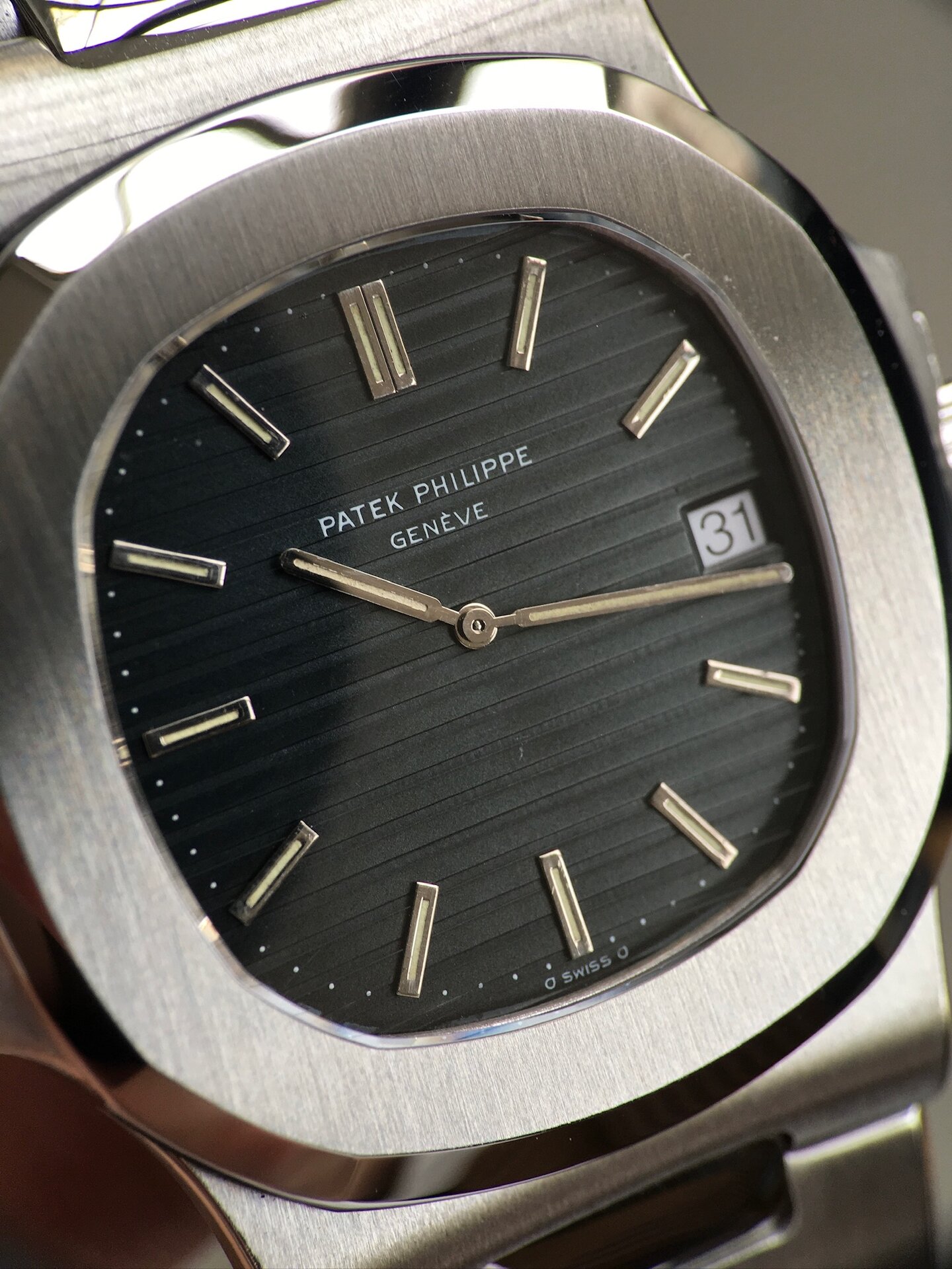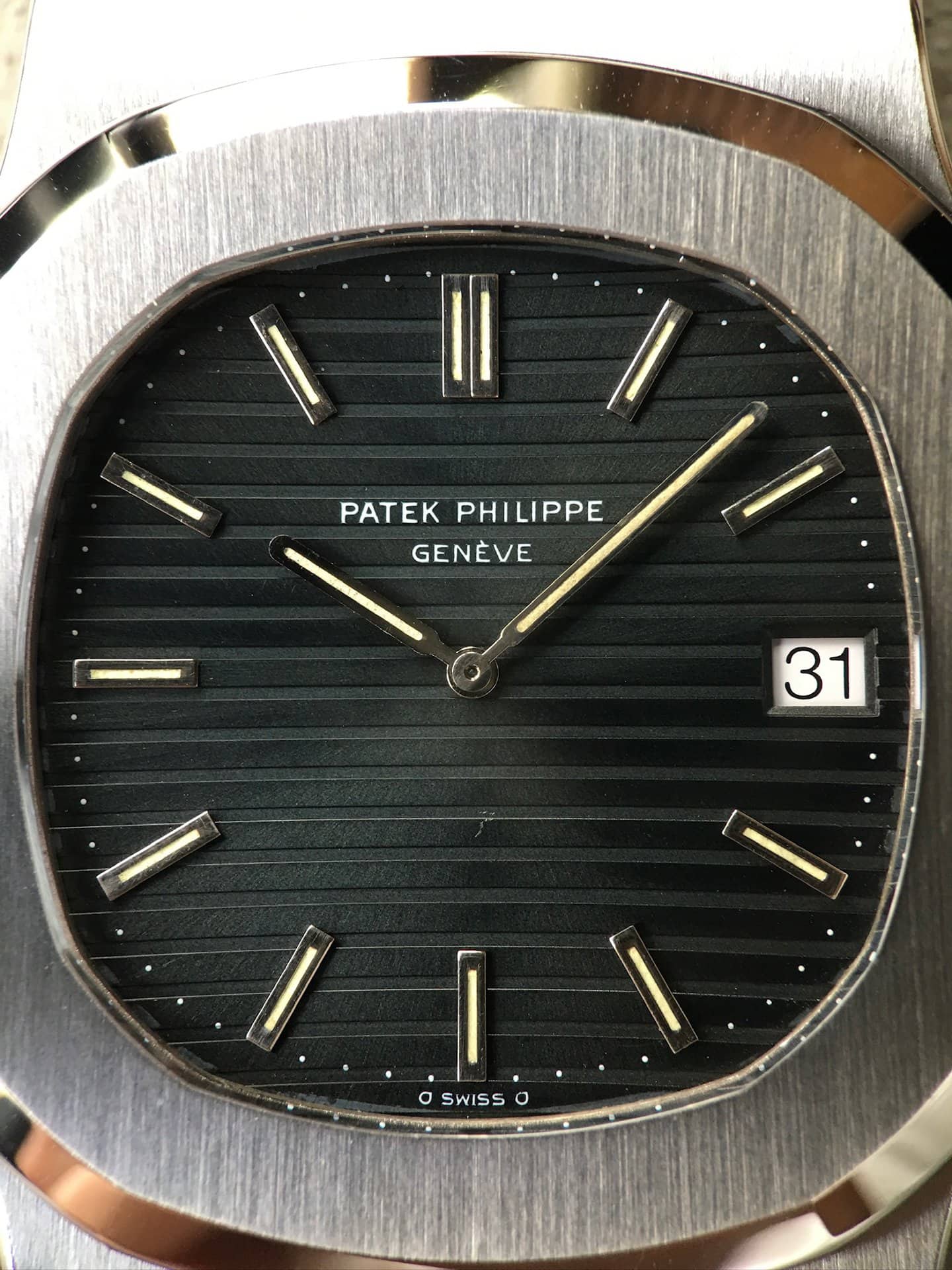 Dial: Patek Philippe has asked to the designer Gerald Genta to come up with a dial reflecting «the true color of the ocean» for this water sports watch. This ended up initially with a very dark blue/grey color. Some of these dial caught a patina with time, some did not. This one retained exactly its original color and remained overall in a superb condition. One can notice under certain angle of light a small hit between the center and 6 o’clock. The tritium luminous on both the original hands and white gold indexes are matching and they are perfectly working (glow green and quickly vanish). The font belongs to the « type 3 bis sherif » according to scholar « mstanga » story book on ref.3700 Nautilus..