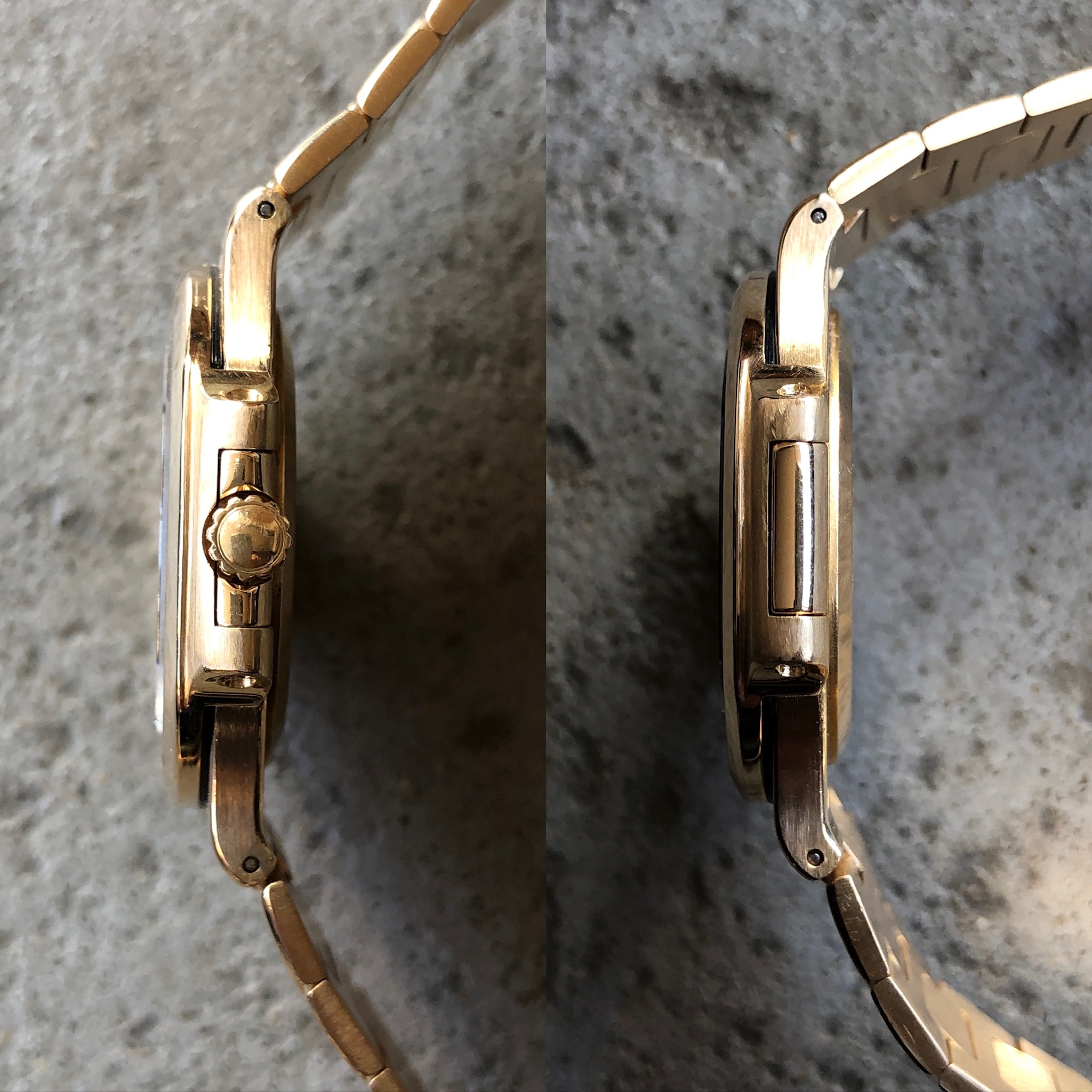 Case: very nice and thick case revealing extremely limited polishing history. The sharp 3D calatrava cross on the clasp speaks for itself. Diameter 37.5mm. Thickness 7.9mm. Weight 136g.