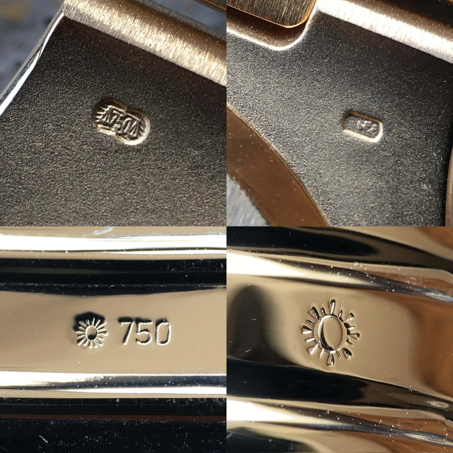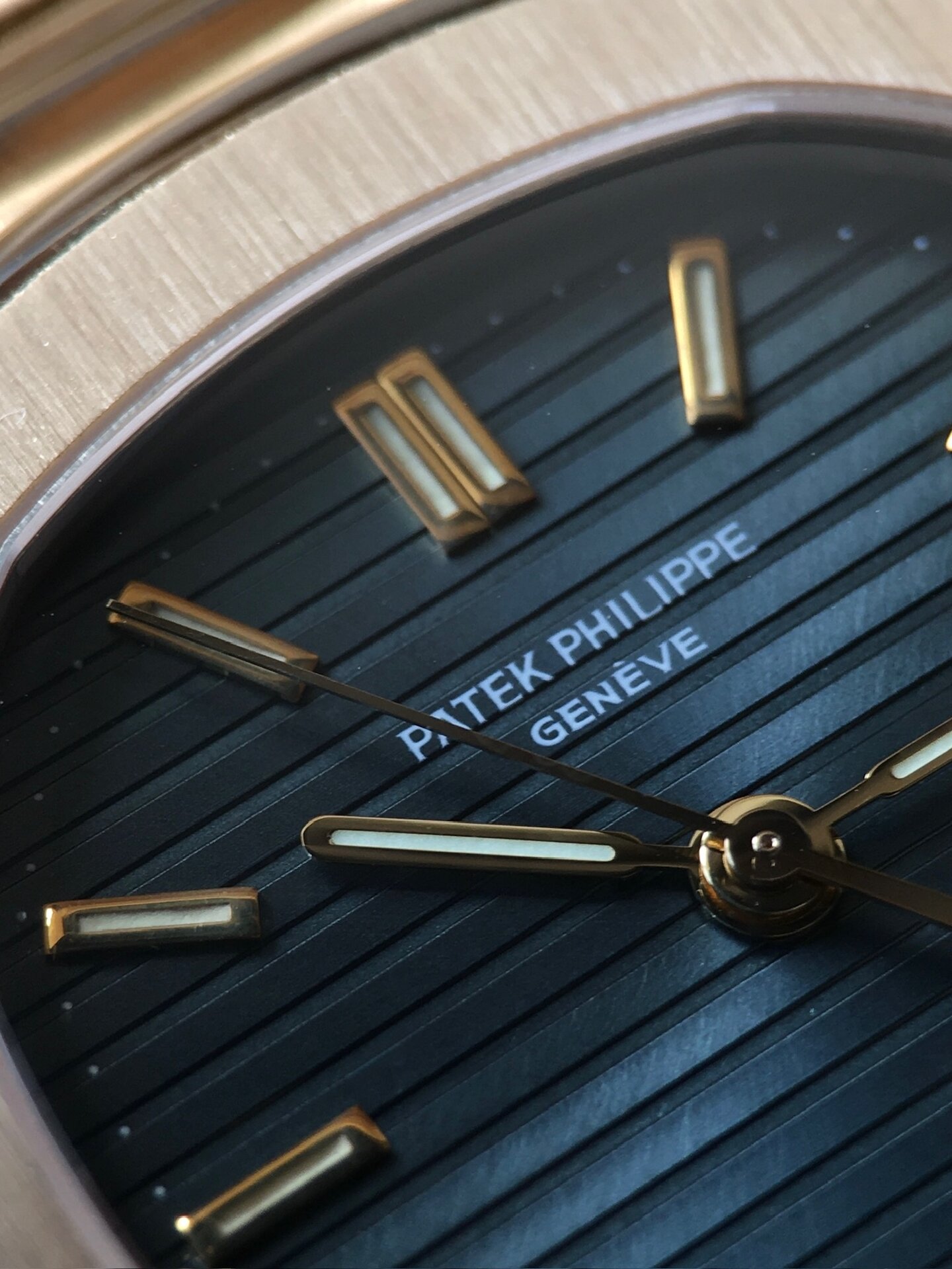 Dial: Deep blue respecting the specifications Mr. Stern imposed to Mr Genta: « the true color of the ocean ». Sigma SWISS Sigma at 6h black date disc and accent on the GENEVE are typical features of the early dials (pre-1989). Yellow gold hour index markers filled with tritium. It flashes green and vanishes quickly which is how the tritium reacts.