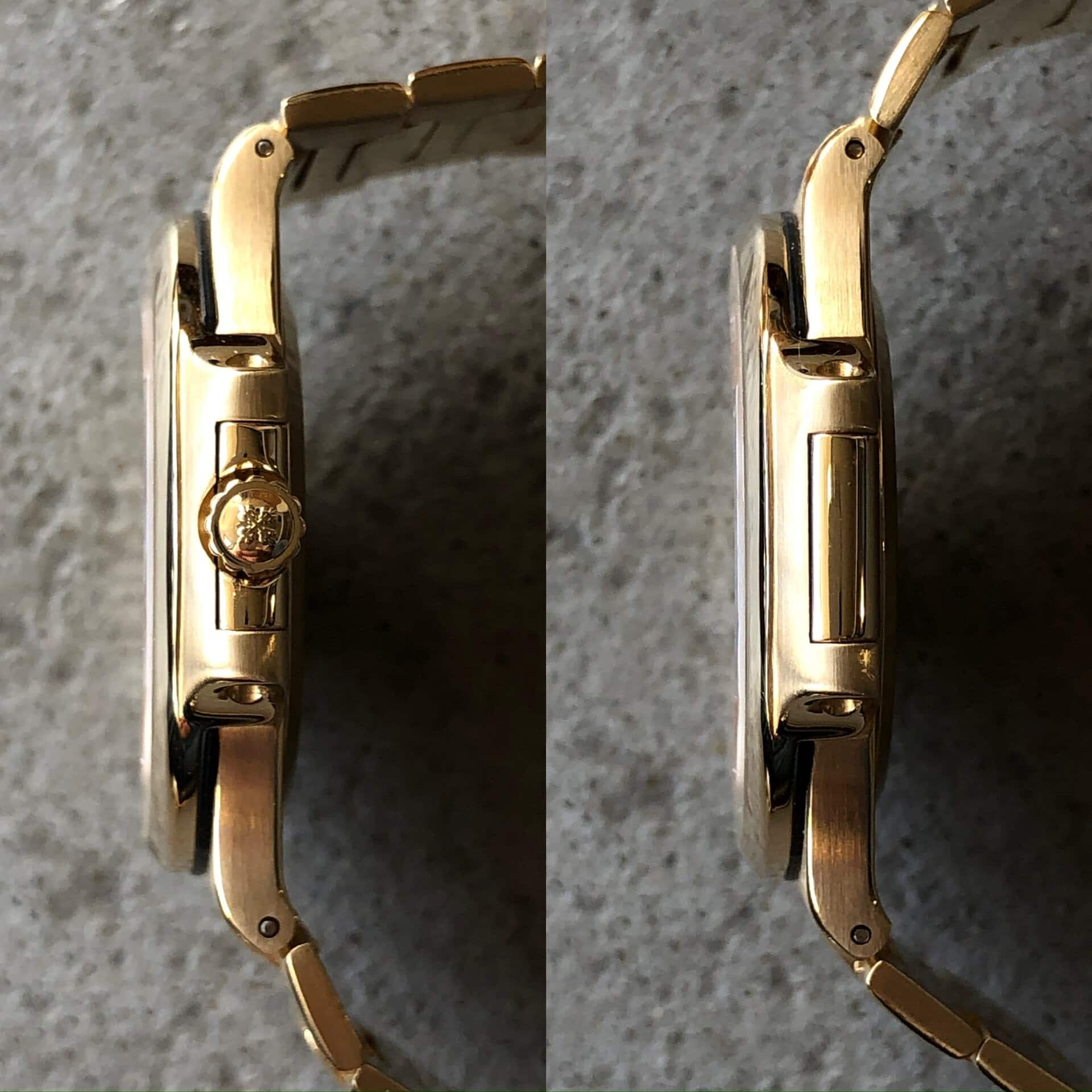 Case: very nice and thick case revealing extremely limited polishing history. The sharp 3D calatrava cross on the clasp speaks for itself. Diameter 37.5mm. Thickness 7.9mm. Weight 136g.