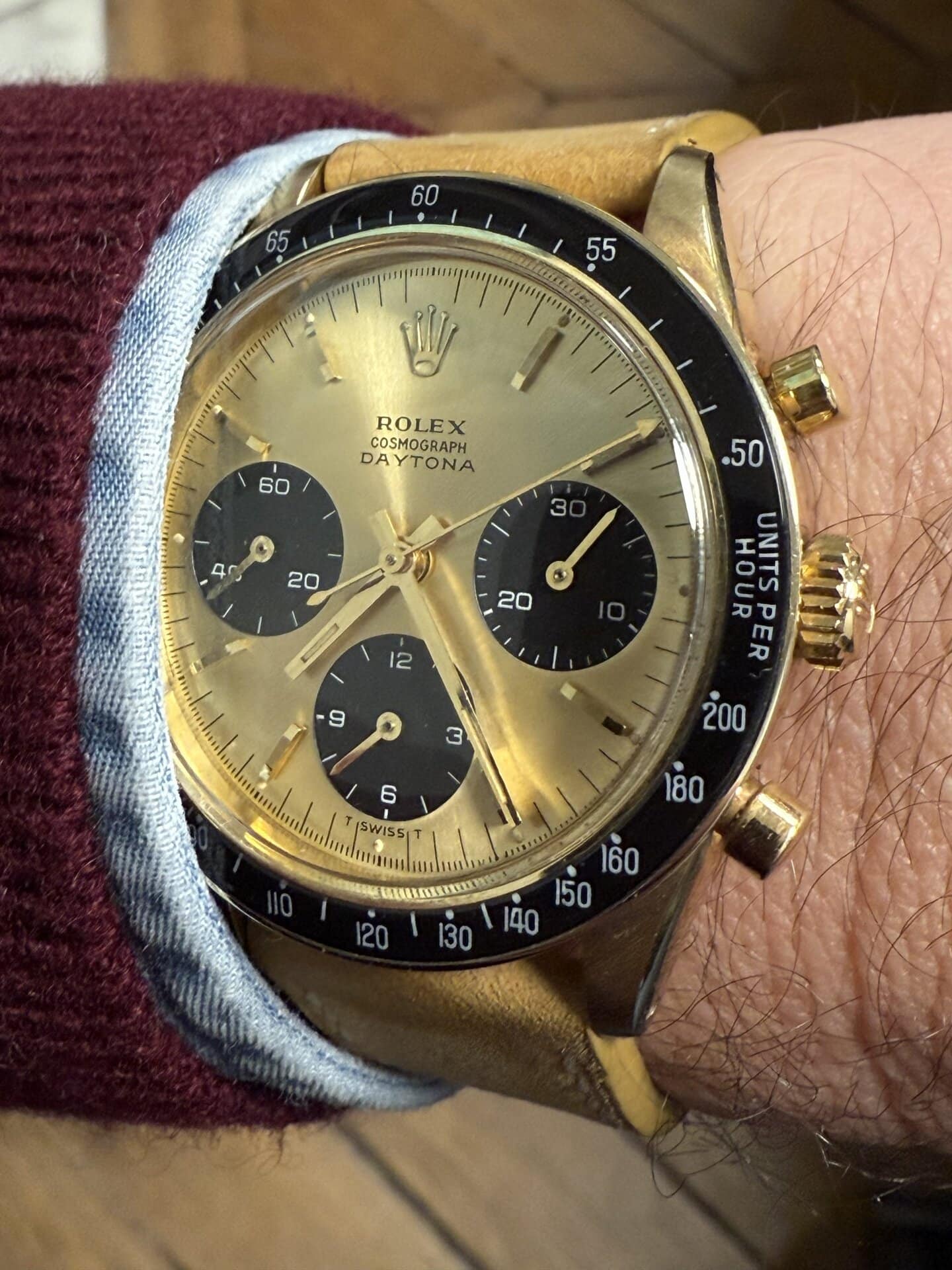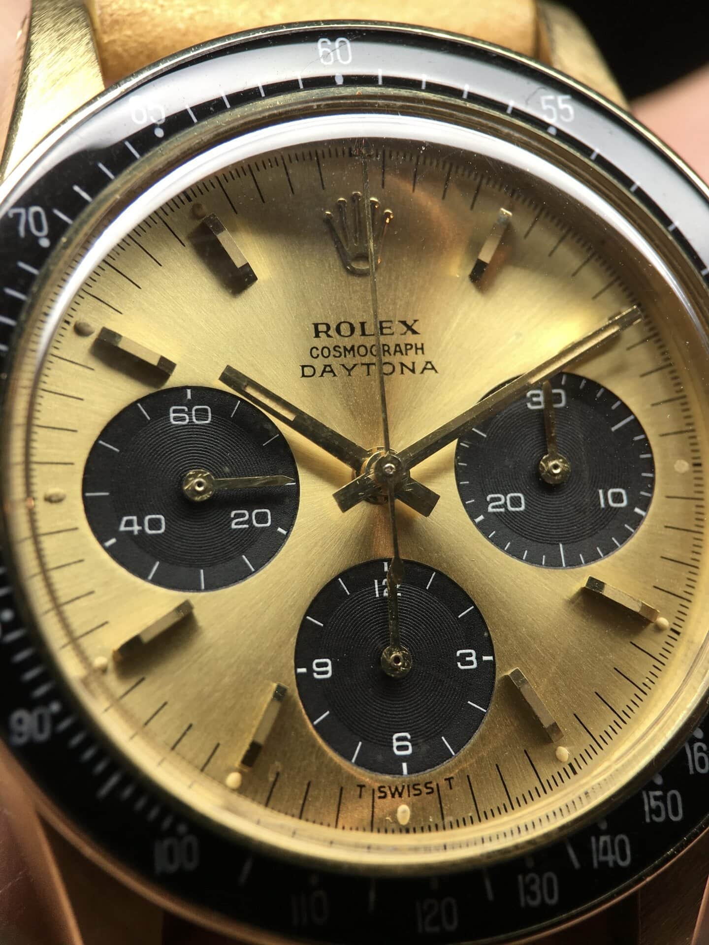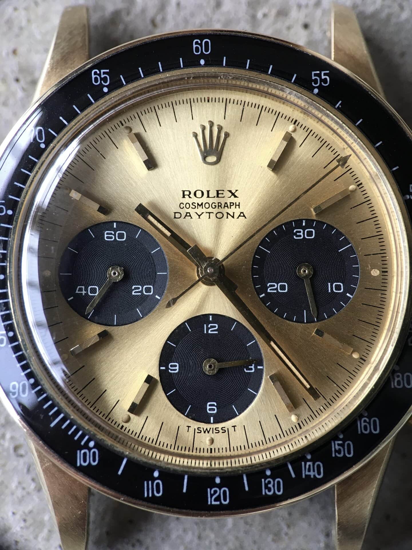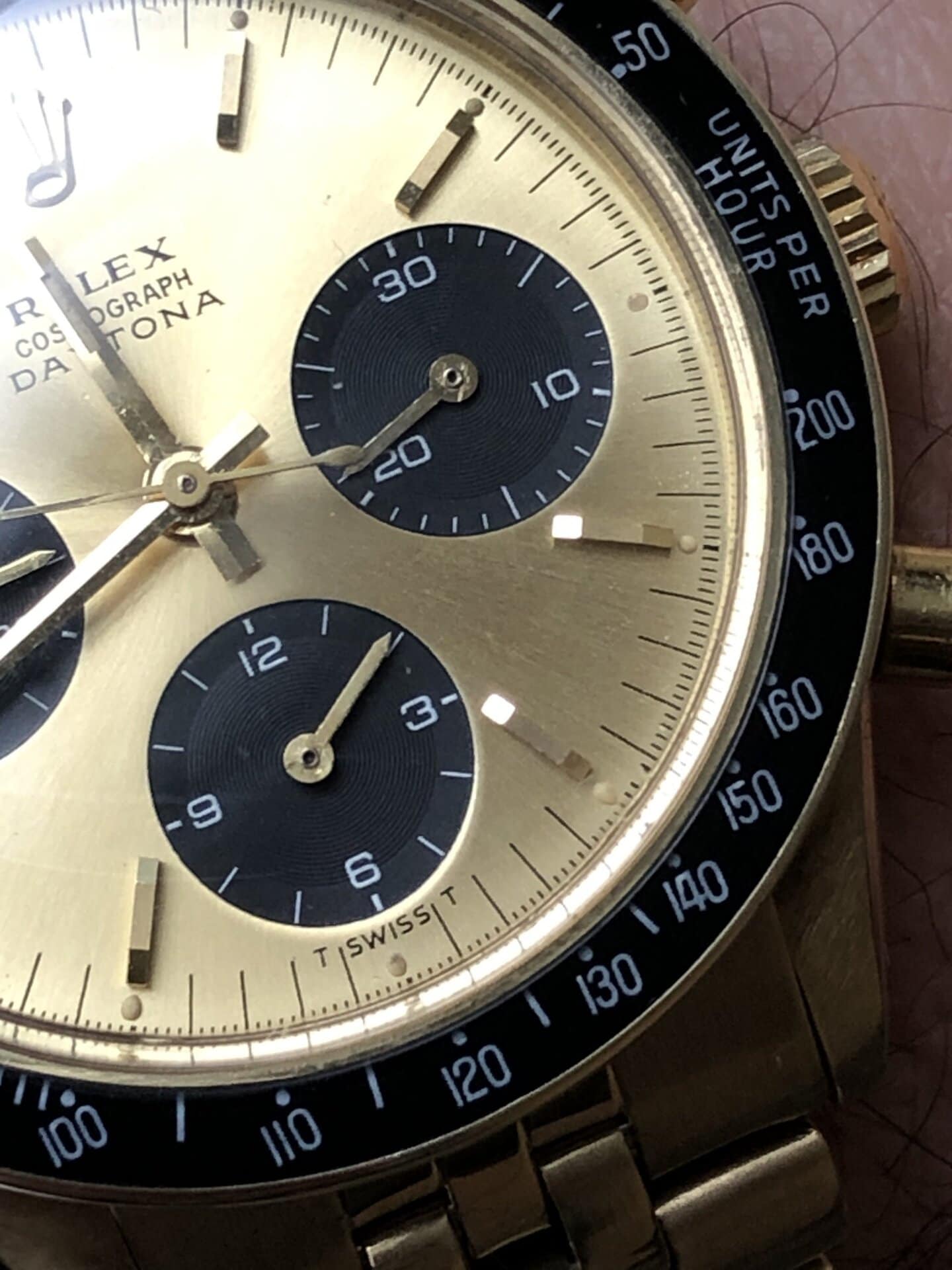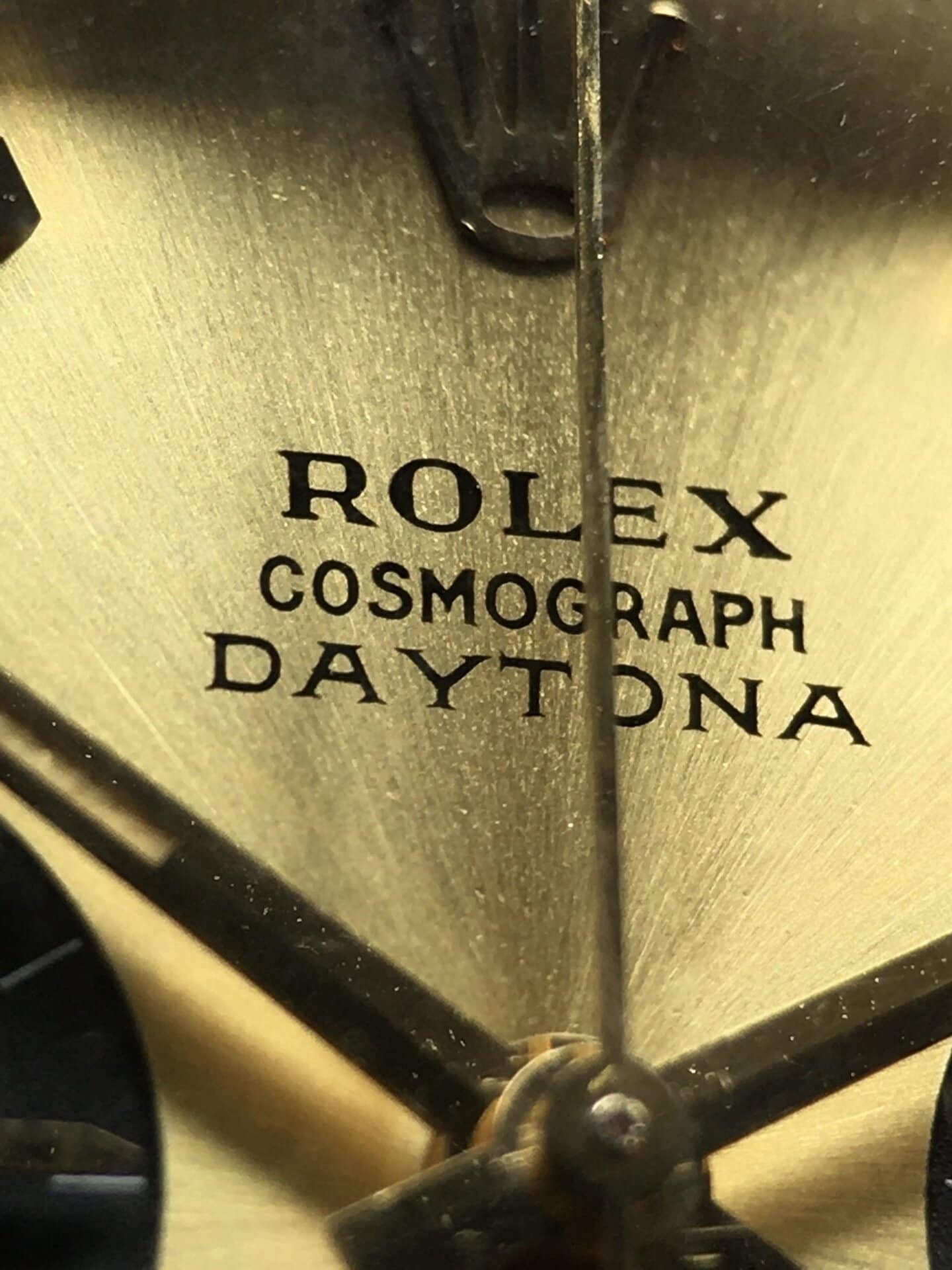 Dial: simply a memerizing dial dancing with the light reflecting in its copper/gold sun rays. The black sherif font of the « DAYTONA » offers a welcome contrast responding to the white graphics of the subdials. All luminous plots are in place and hands luminous is matching the index. UV test make them all glow green & vanish.