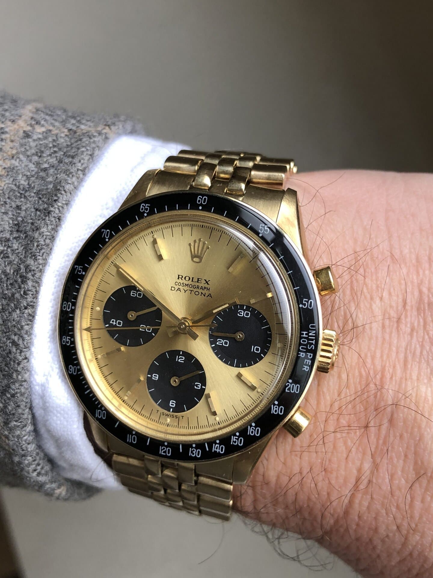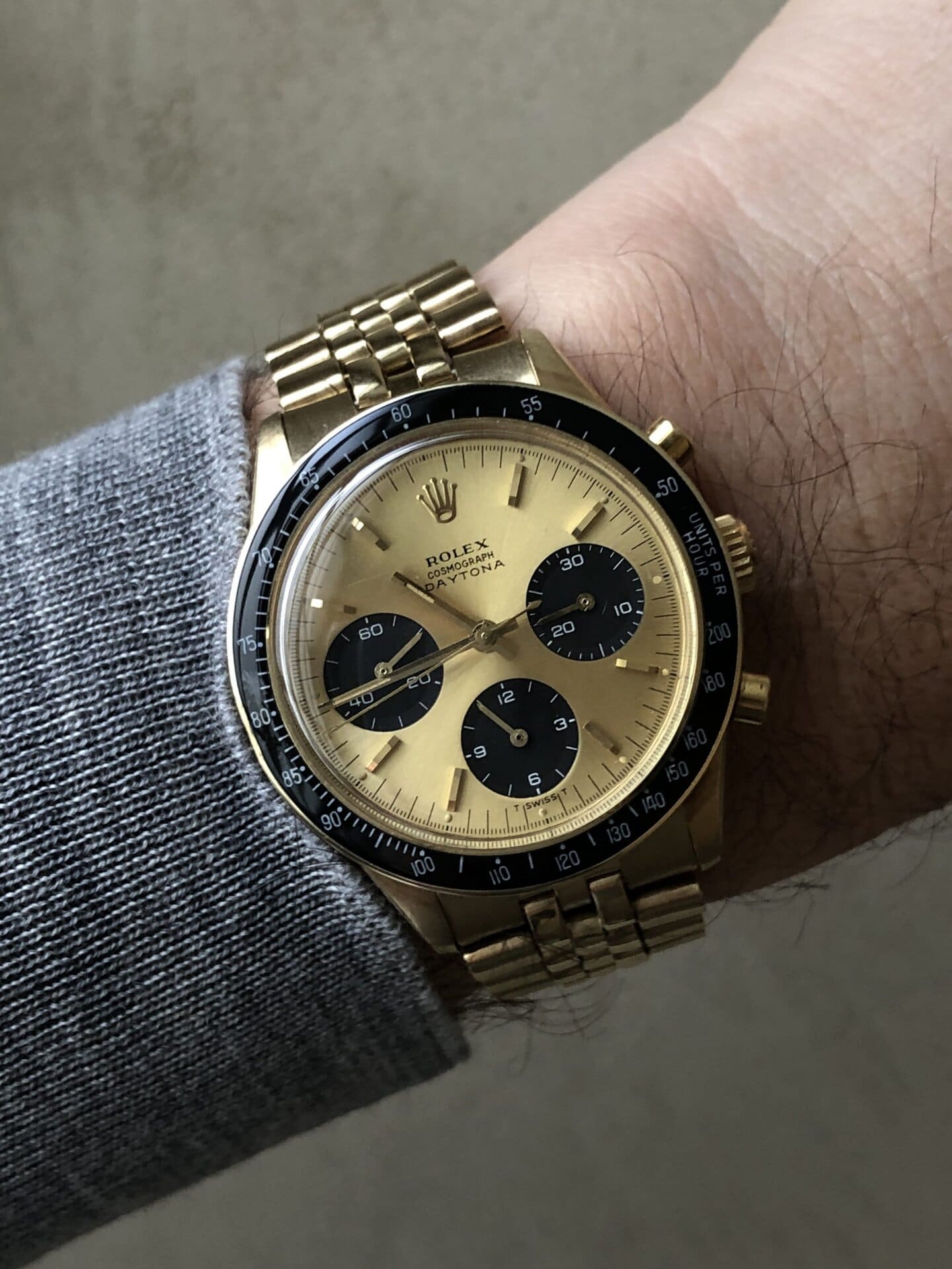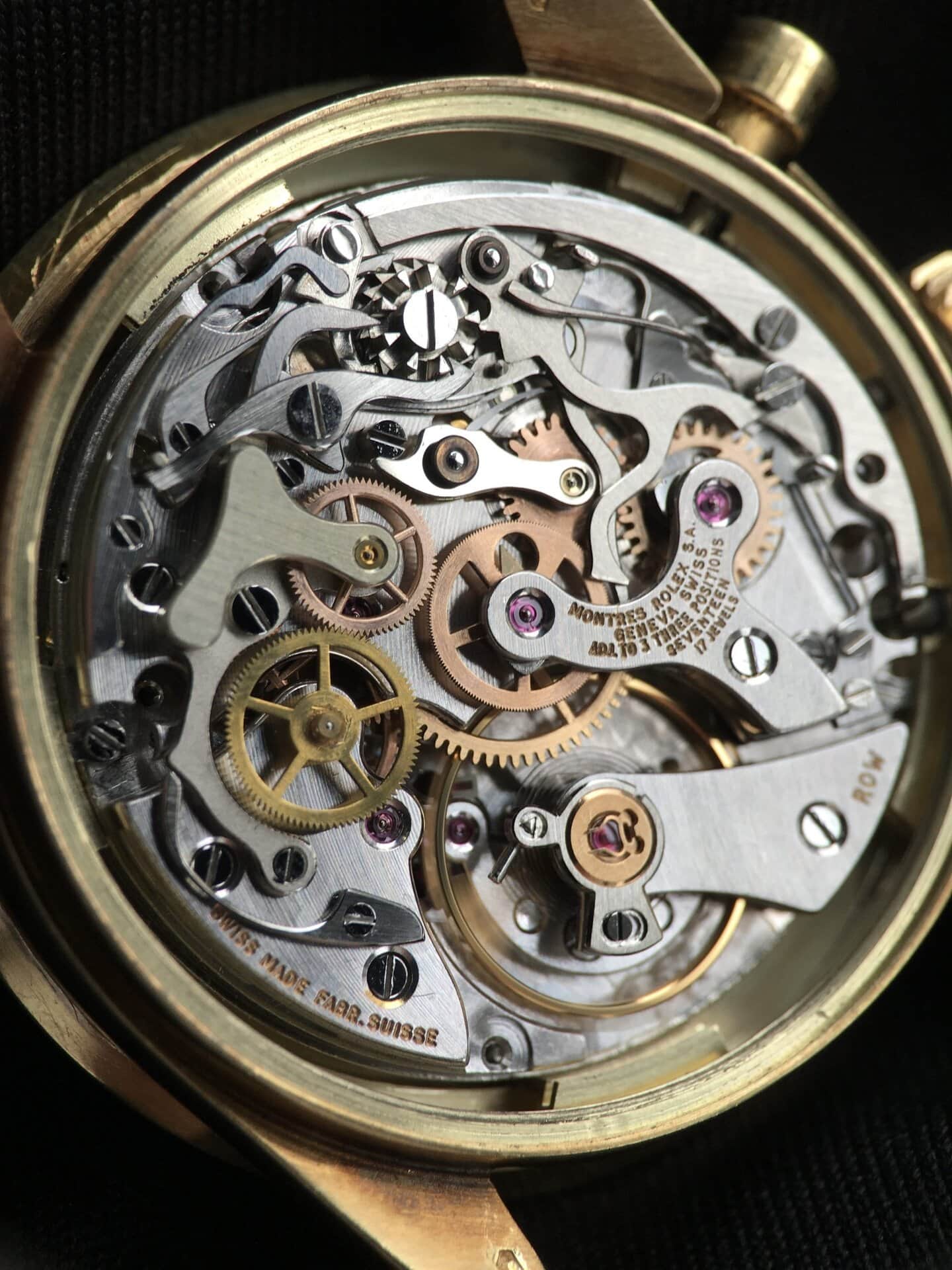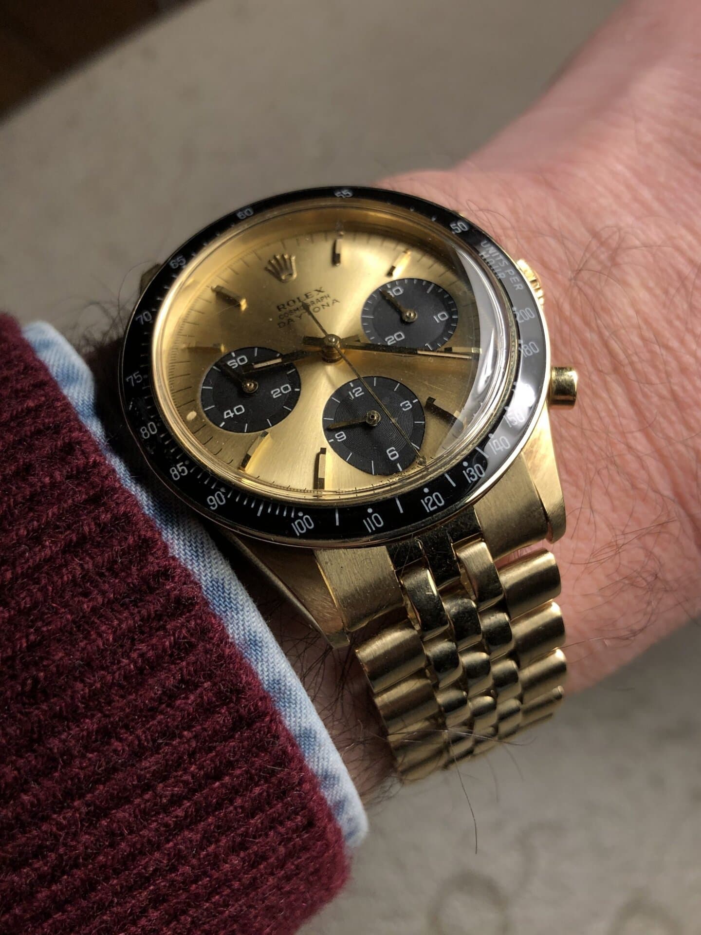 Dial: simply a memerizing dial dancing with the light reflecting in its copper/gold sun rays. The black sherif font of the « DAYTONA » offers a welcome contrast responding to the white graphics of the subdials. All luminous plots are in place and hands luminous is matching the index. UV test make them all glow green & vanish.
