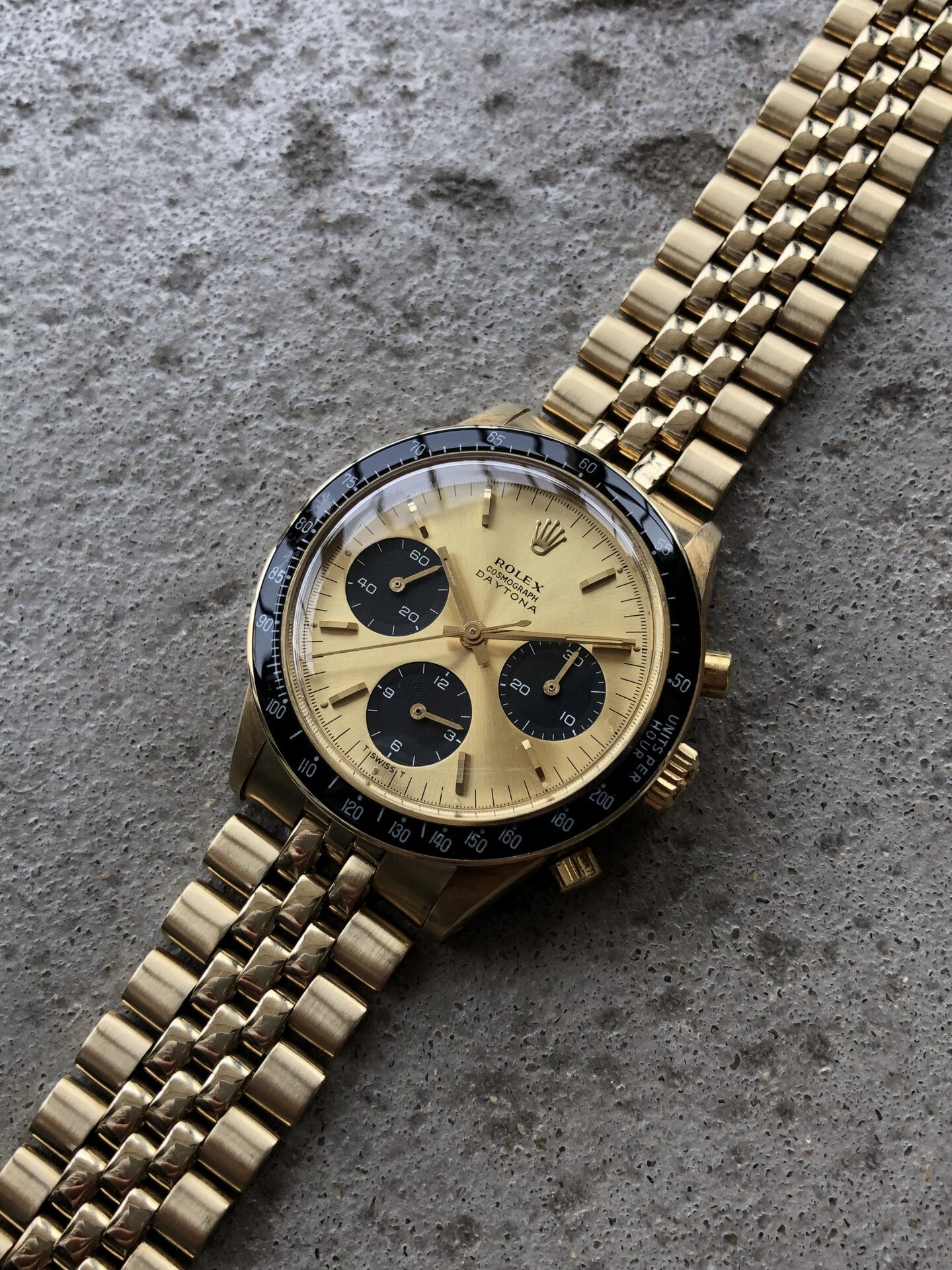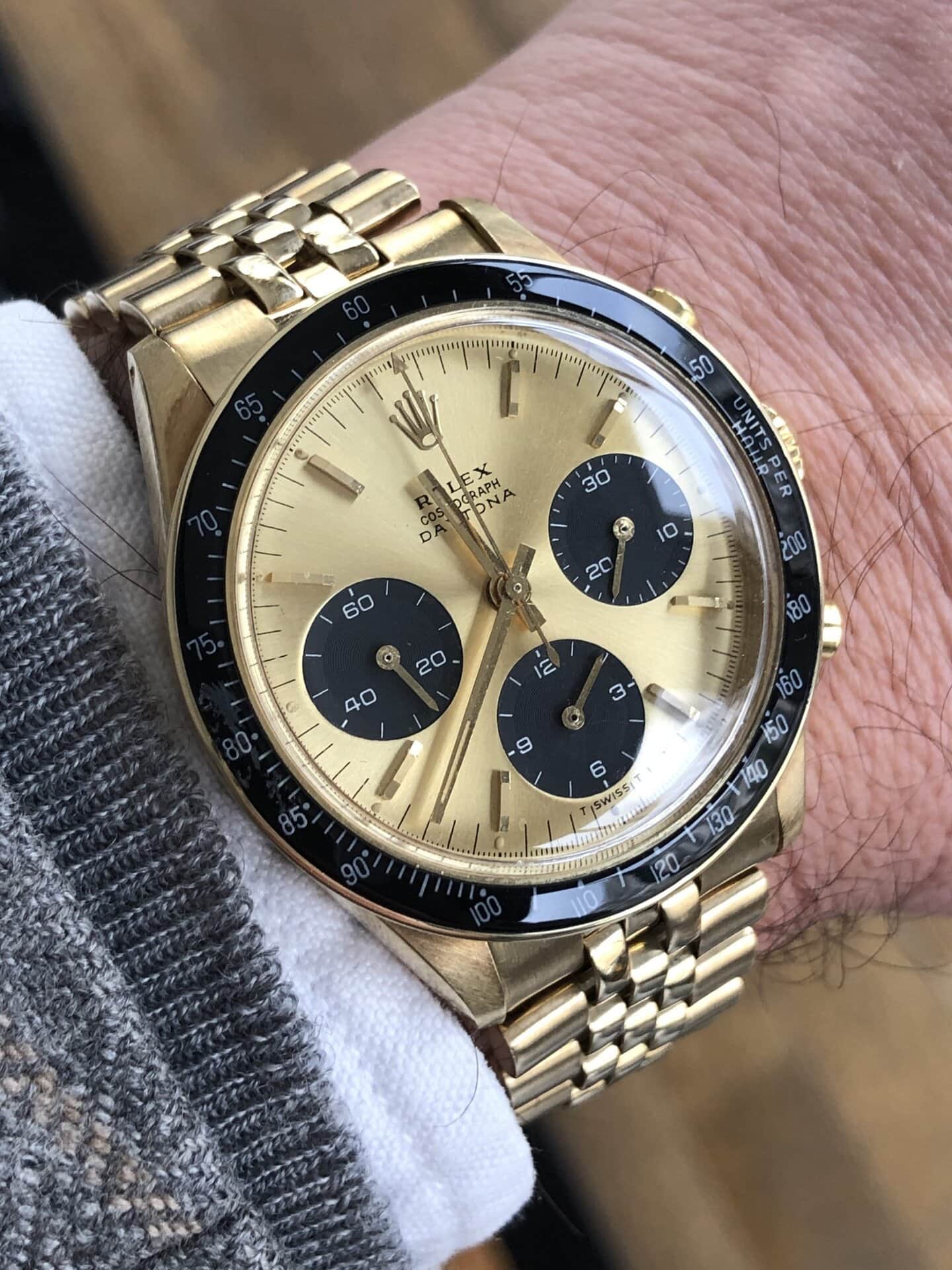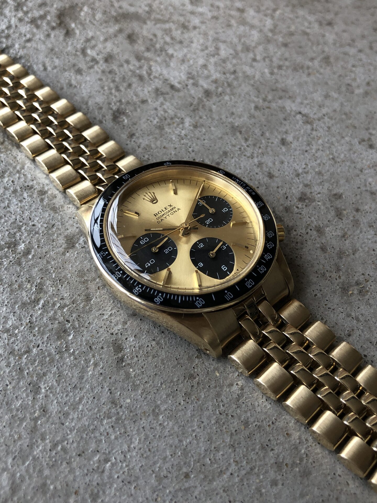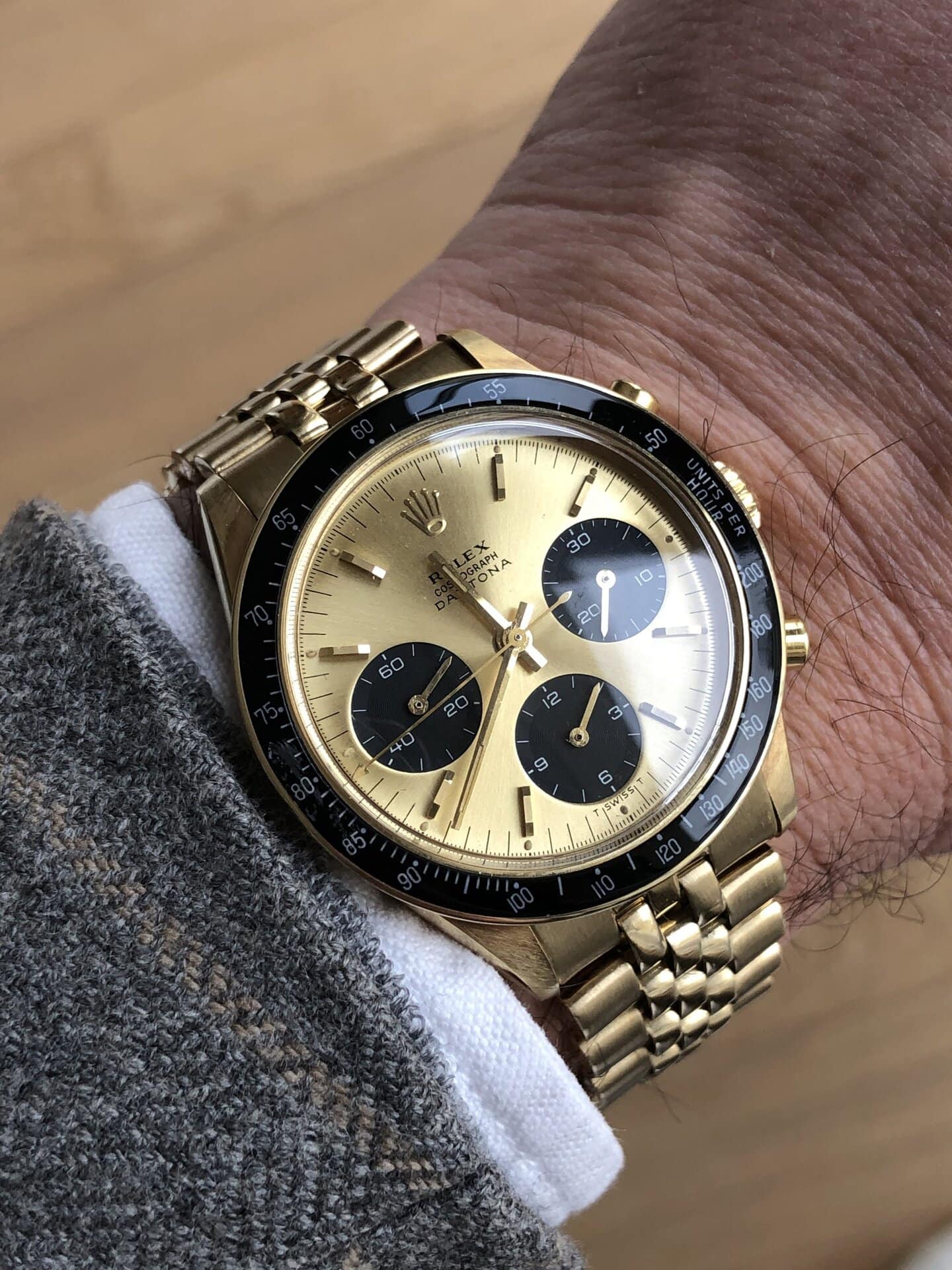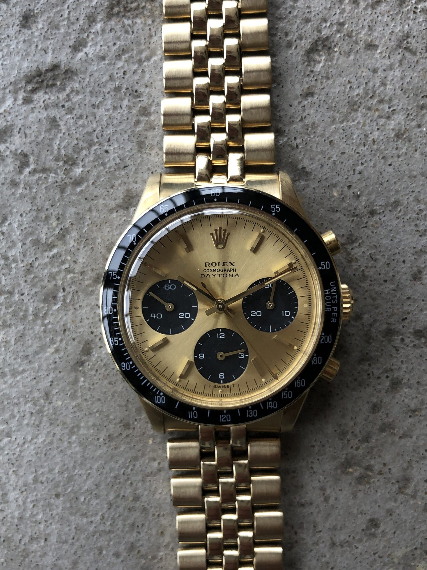 Dial: simply a memerizing dial dancing with the light reflecting in its copper/gold sun rays. The black sherif font of the « DAYTONA » offers a welcome contrast responding to the white graphics of the subdials. All luminous plots are in place and hands luminous is matching the index. UV test make them all glow green & vanish.