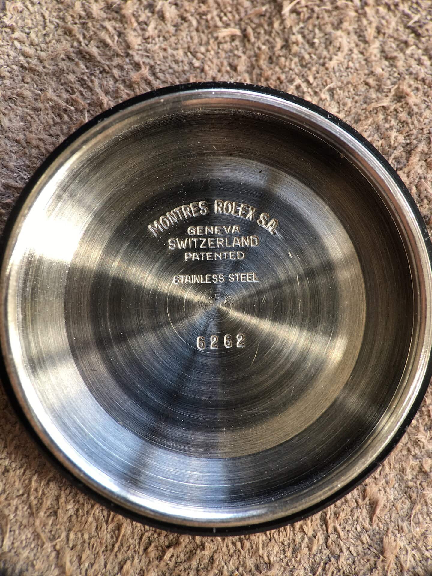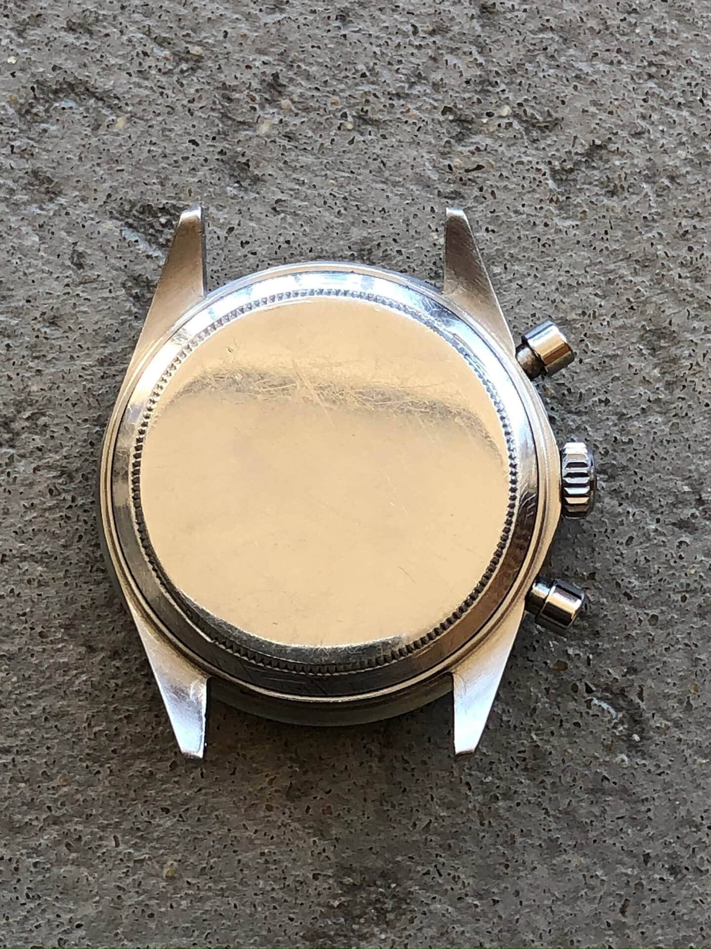 The case is extremely thick and razor sharp. Original short pushers. Caseback engraved 6262 as per usual for period when Rolex was either using contemporary watches parts or even exhausting parts of their previous references.
