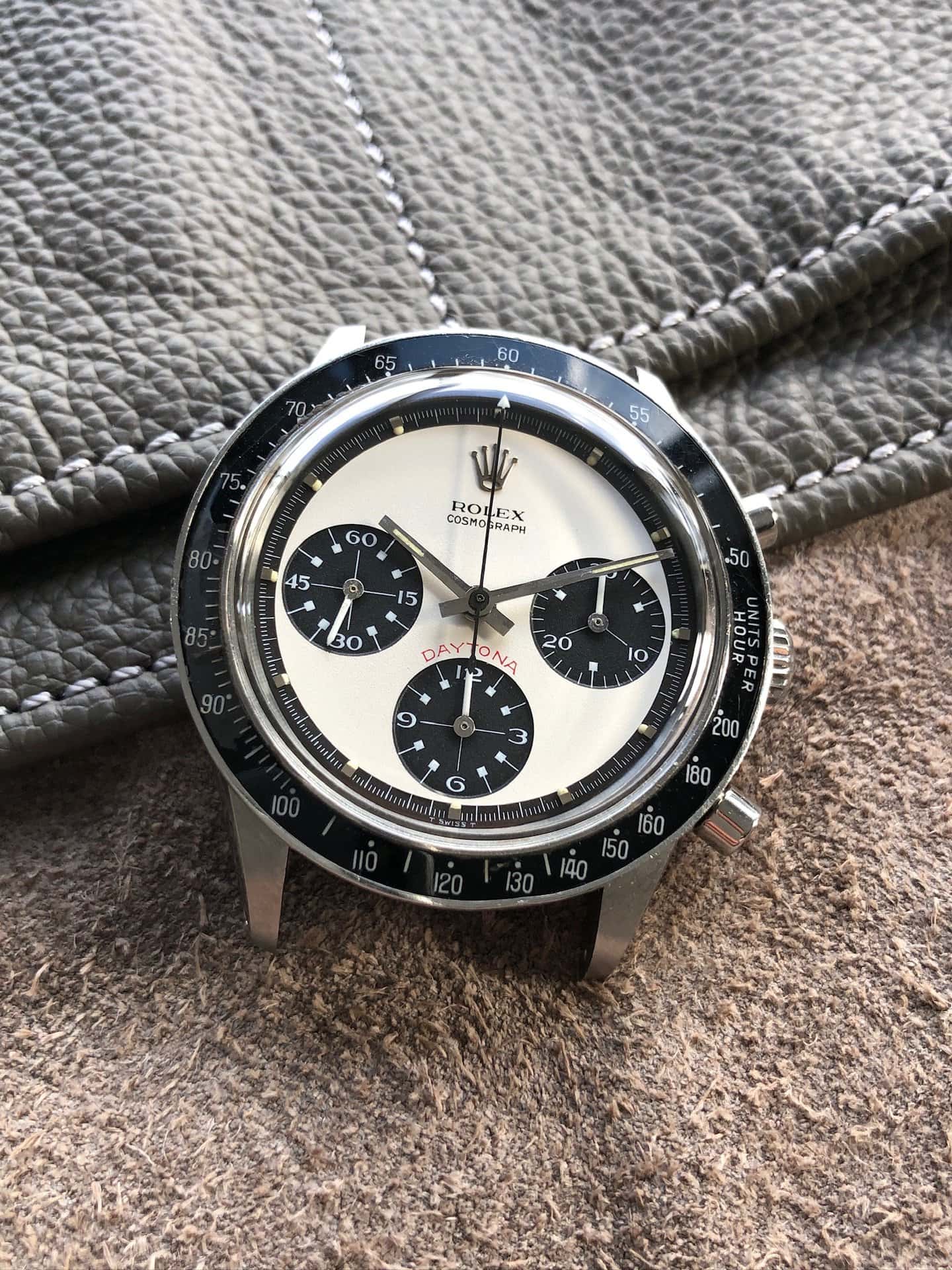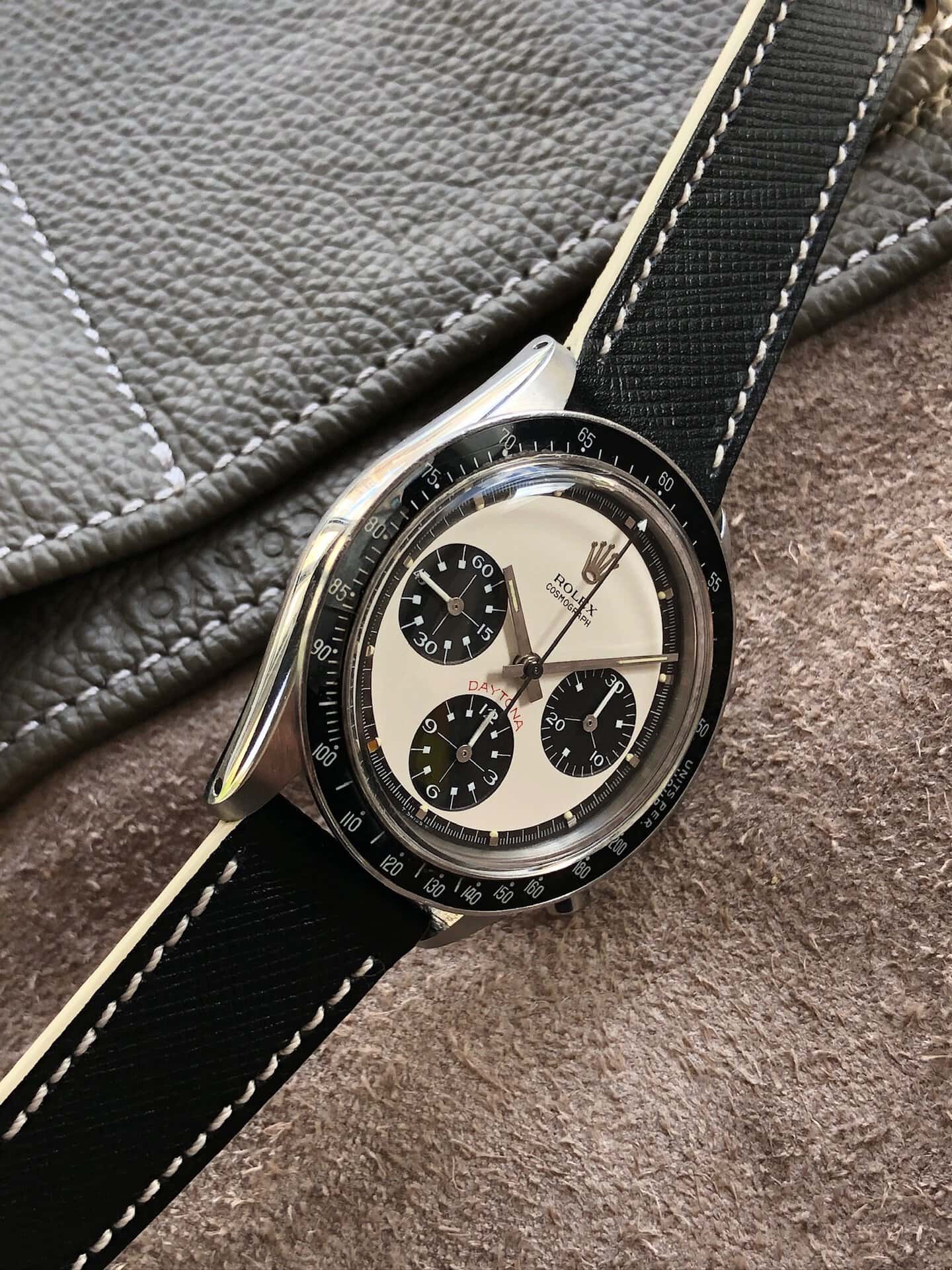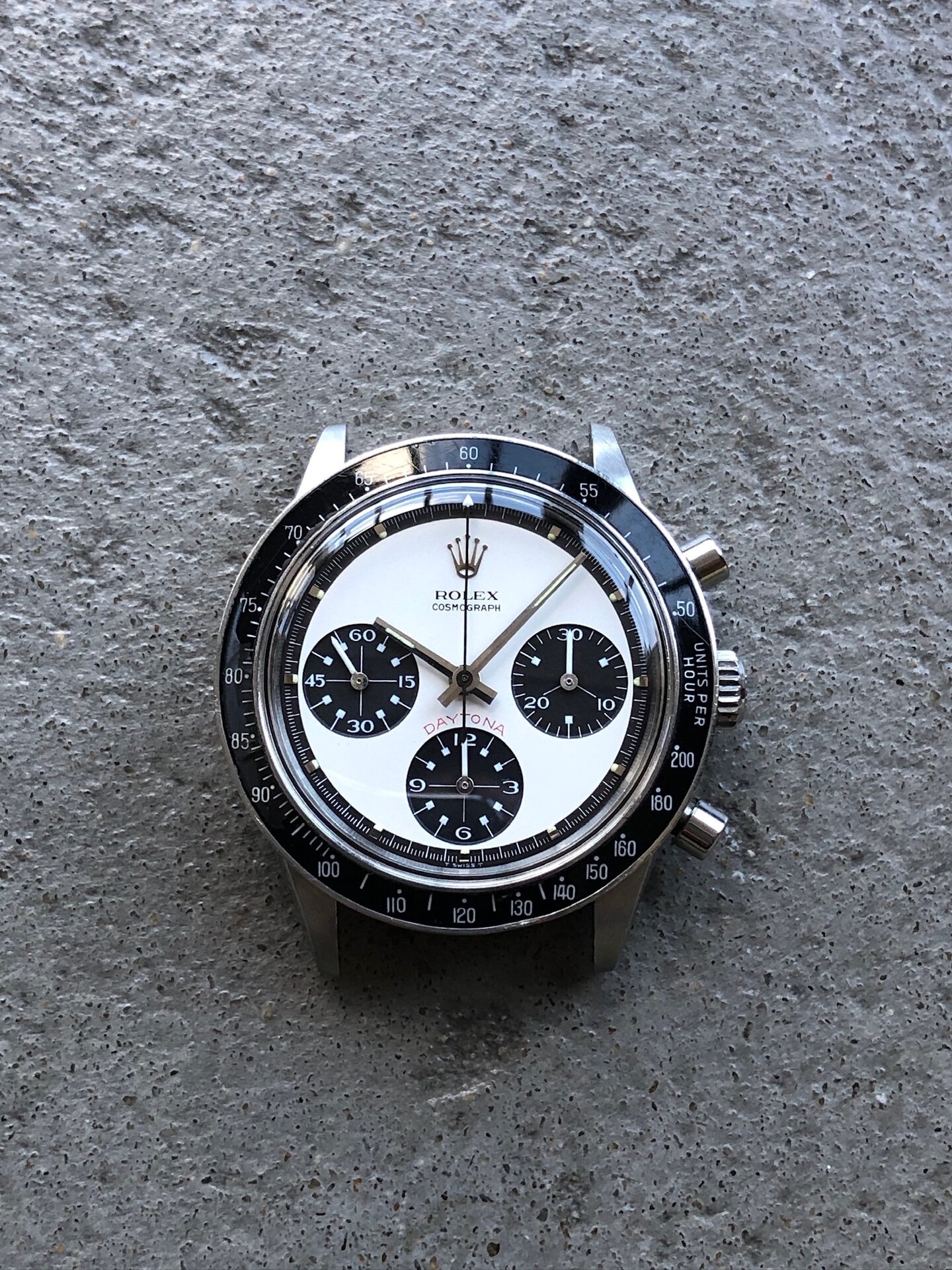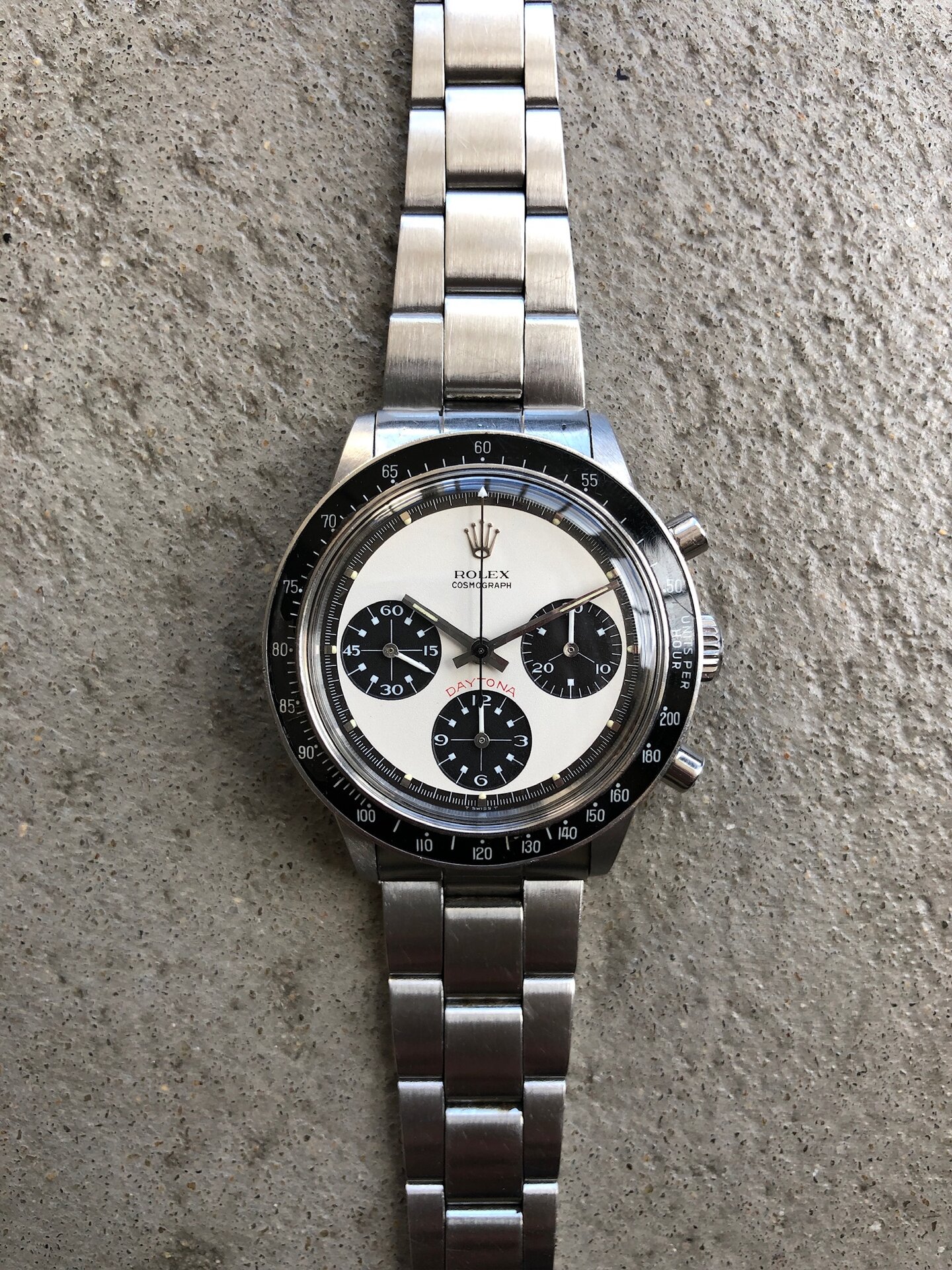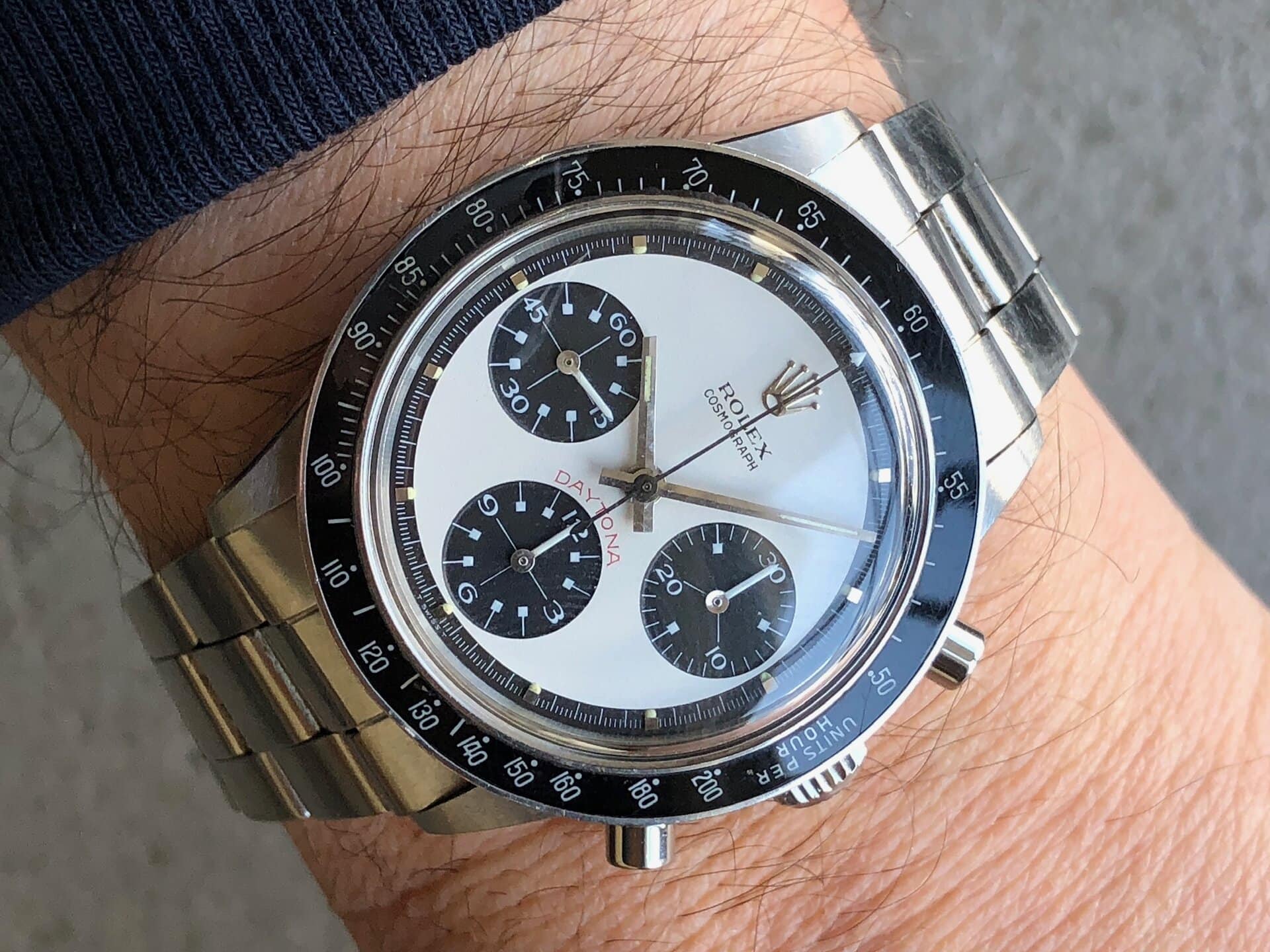 One of the rarest and most desirable variant Paul Newman dial of the pump pushers era. The two-color dial so-called « Panda » here in exceptional condition. This reference had the smallest production run of all steel Daytona with only about 1700 made. Then put your assumption about how many of them were featured with the exotic dial version (aka « Paul Newman », assumed less than 10% of 6264) and finally how many are still in this preservation state today? Very VERY few!
